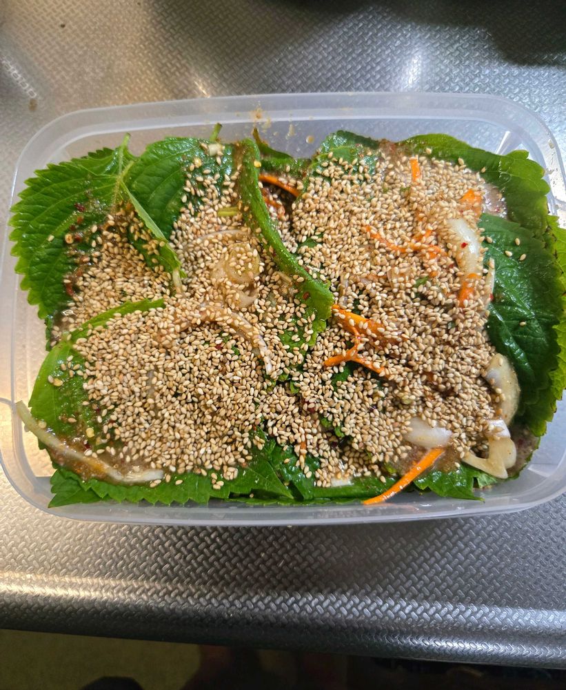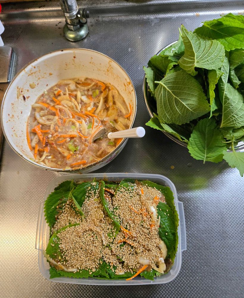 ボールにタレを作っておいて、タッパの底にタレを伸ばす程度にひいて、そこに葉っぱをひいて、1枚づつにタレをつけて重ねていきます。