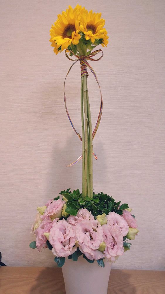 トルコキキョウの中心からすっくと立つヒマワリの花。