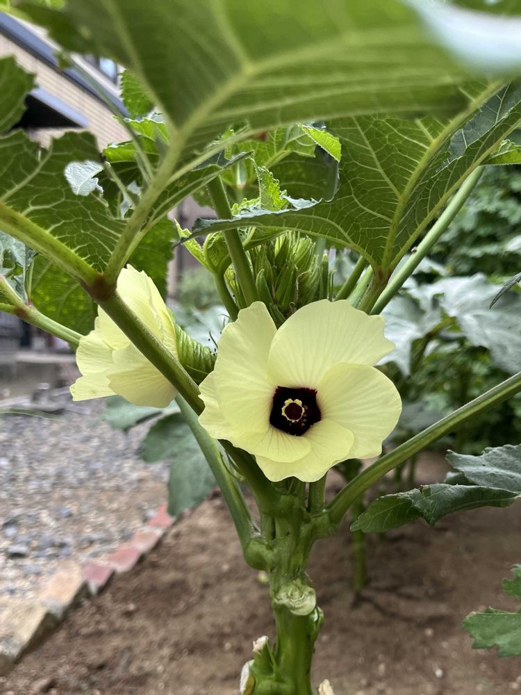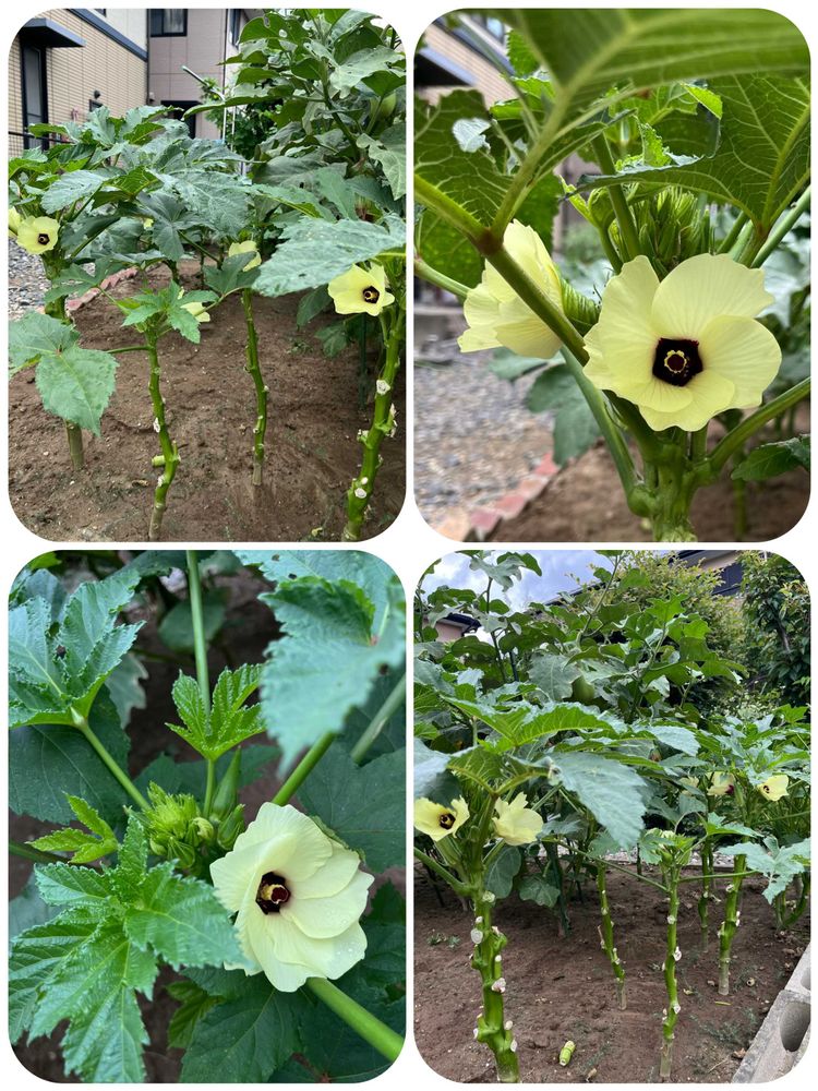 今朝はオクラのお花が沢山咲いて 改めて綺麗だなと(ღ*ˇ ˇ*)。o♡🌼🌼🌼