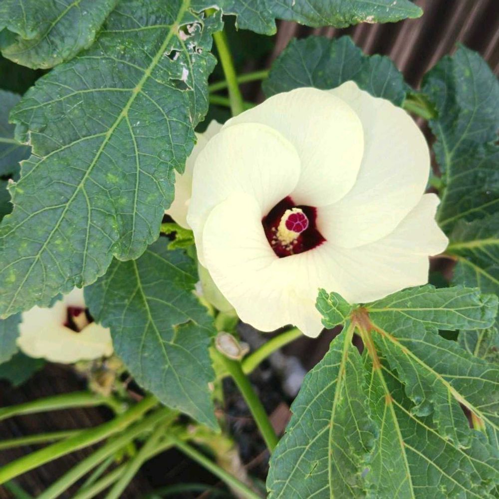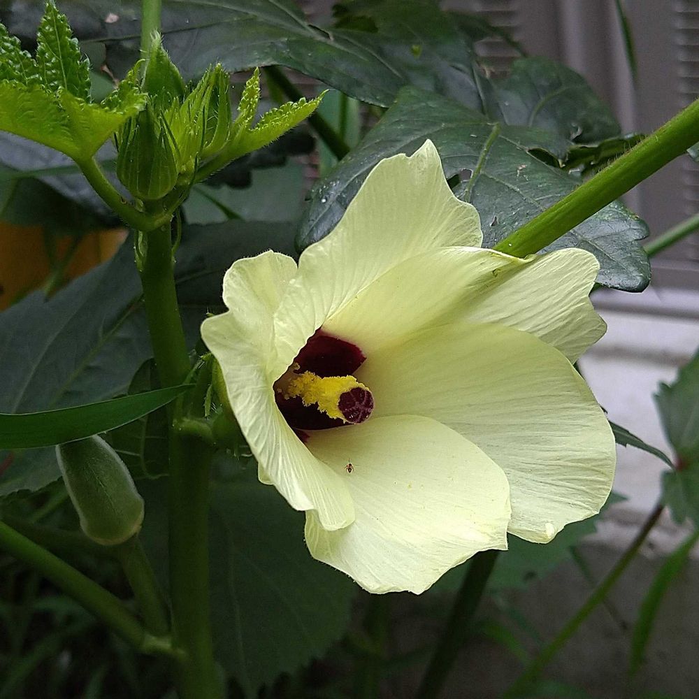 ・オクラの花は朝に咲いて夕方にはしぼんでしまう1日花です。淡いクリーム色に赤紫色の中心が特徴的です。