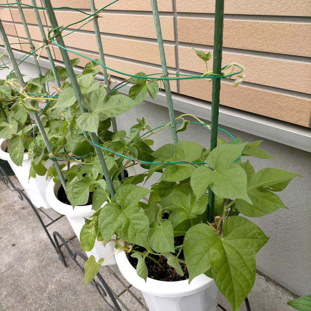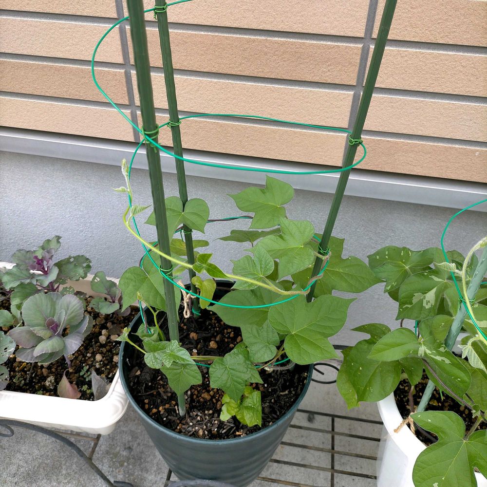 【3枚目】西洋朝顔のスノーフレークは大人しく成長中。西洋朝顔ってヘブンリーブルーみたいに生育旺盛かと思っていたけど、この品種はかなり大人しめのようです。