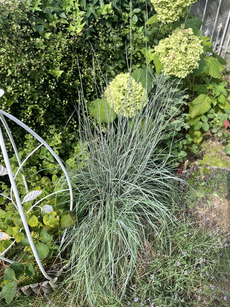 猛暑の庭で、1人涼しい顔はスキザクリウム。4回目の秋を前に、青味がかった葉からもう穂を上げ始めました。