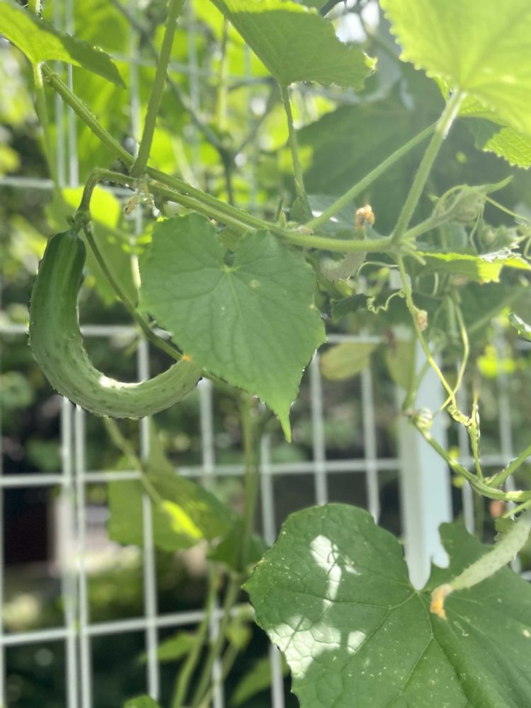 ブドウかと思えばキュウリ。雨降ったのに曲がってるじゃない。収穫は一段落、小さな実がちらほら🥒