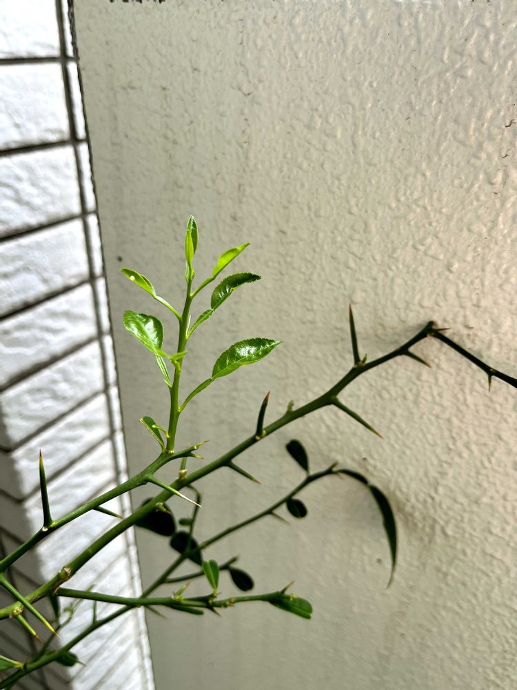 250808 アゲハ蝶産卵。1枚目写真は産卵中。だいだいの木の新芽を狙って産卵。羽を広げると大きく10-12cmにもなり、バタバタ飛んでました。以前の幼虫🐛も蛹になり飛び立ち一段落したのですが、また忙しくなります😄幼虫くんに食べられただいだいの木も、新芽がたくさんついてきました。食べられると刺激になる?😄