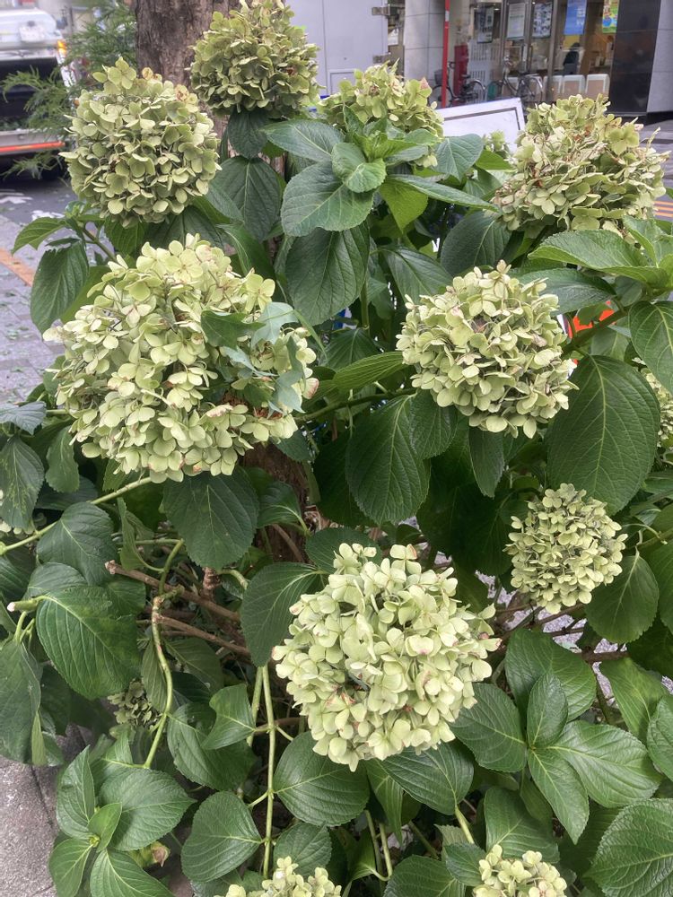 呉服屋の前の日陰の「アジサイ」が放ったらかしのままでドライフラワーのようになっていた。