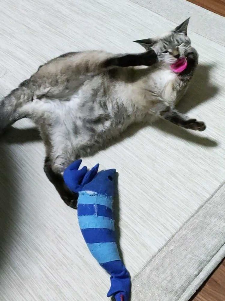 シロ。さん割れた鈴ボールと蹴り蹴りの魚さんがお気に入り…鈍くさいと思ってたらネズミとモグラどっちも獲ってきた(☉。☉)!