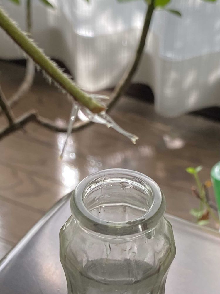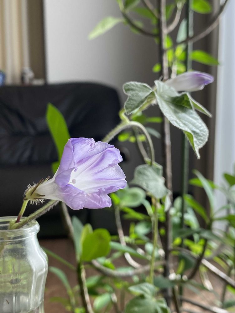 アサガオさんのツルをカットしたら蕾が付いていたので小瓶に挿していたら、小さなお花を咲かせてくれました♡
