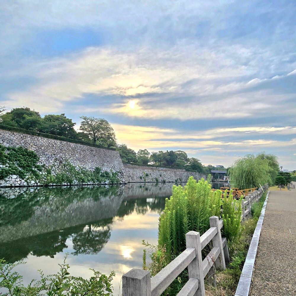 内濠に朝陽🌄がキラキラ✨空の雲も綺麗なグラデーション👏👏