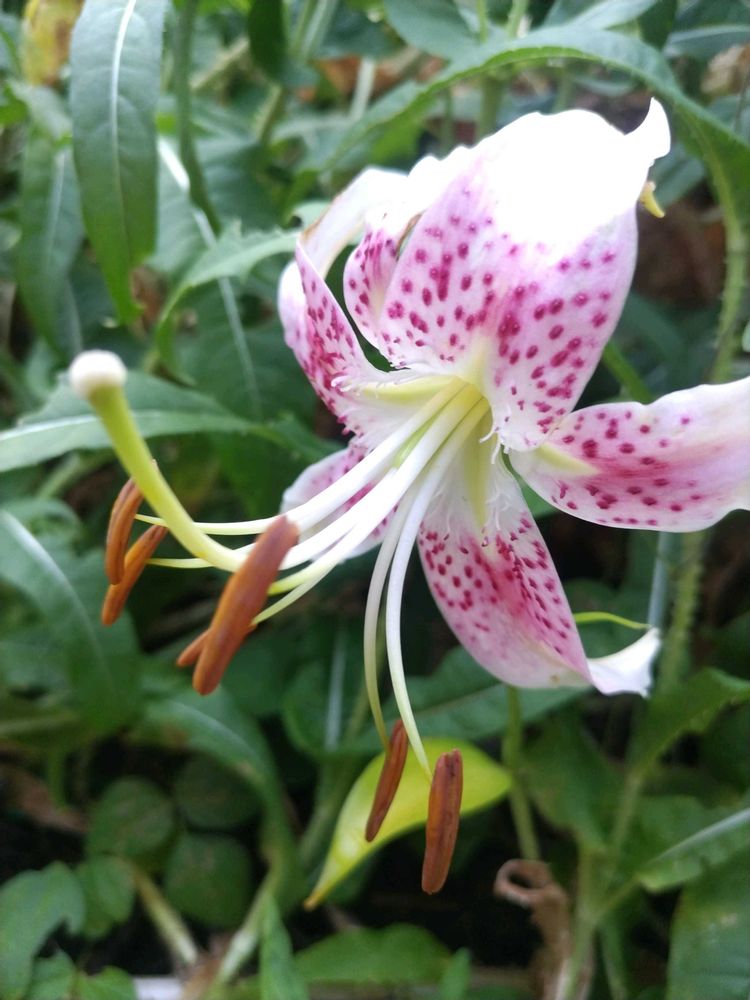 大好きなカノコユリを見てみると、チーゼルの下敷きになりながら咲いていました。来年はこのカノコユリ移植しないと。
