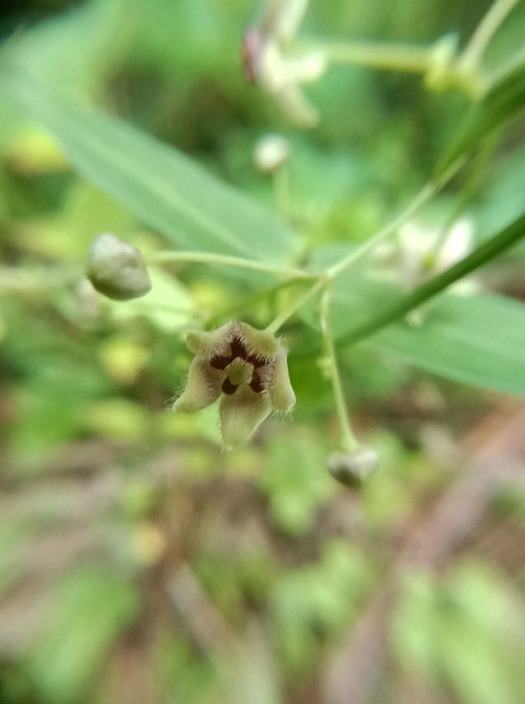 花は葉腋から伸びた柄にそれぞれ多数付き、花冠は4-6mmと小さく、先端は5裂で平開し、裂片内側に毛が見られます。花色はエンジ色で濃いもの、淡いもの、時に白花があります。