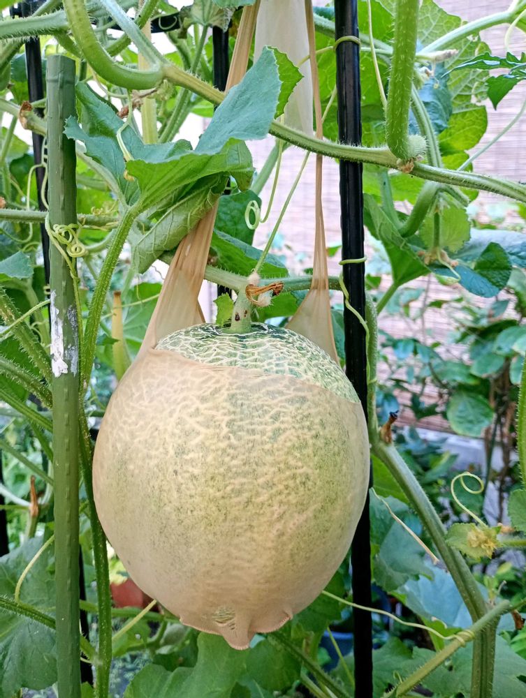 🍈🧦、ストッキングを利用しホールド🤲キープしていた🍈メロンを収穫しました。先のもうひとつは形が今ひとつ😅