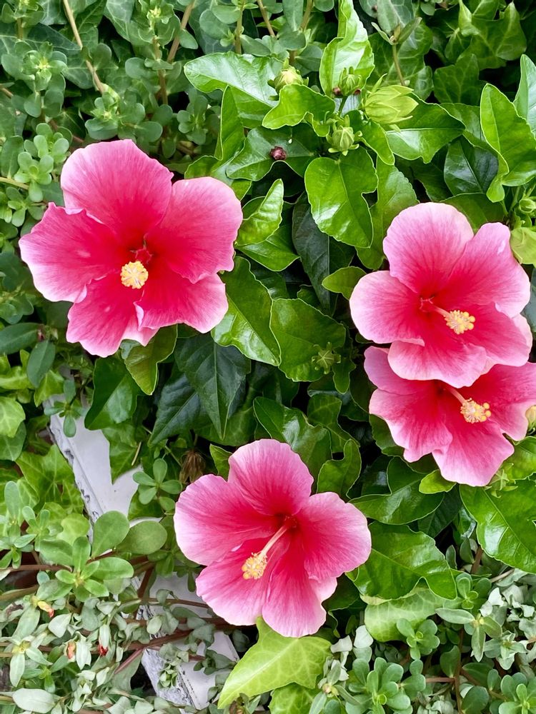 最寄り駅前の花壇や歩道の鉢ねハイビスカスが鮮やかです🌺