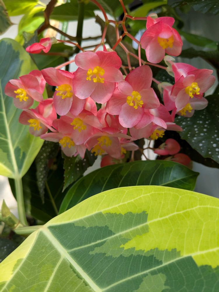 二階テラスでは木立ベゴニアが満開に〜ゴムの木鉢に挿し木したら大きく成長✨