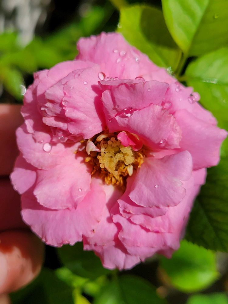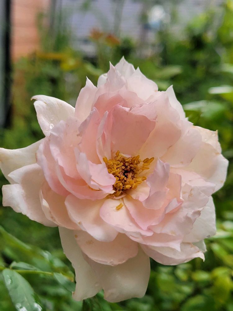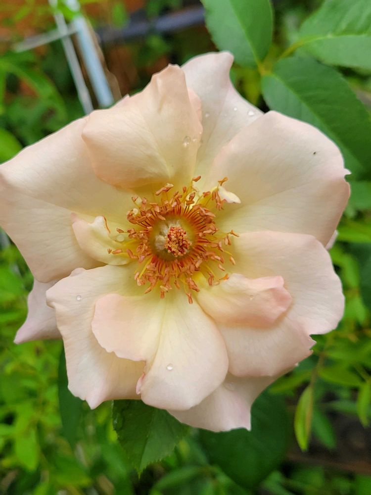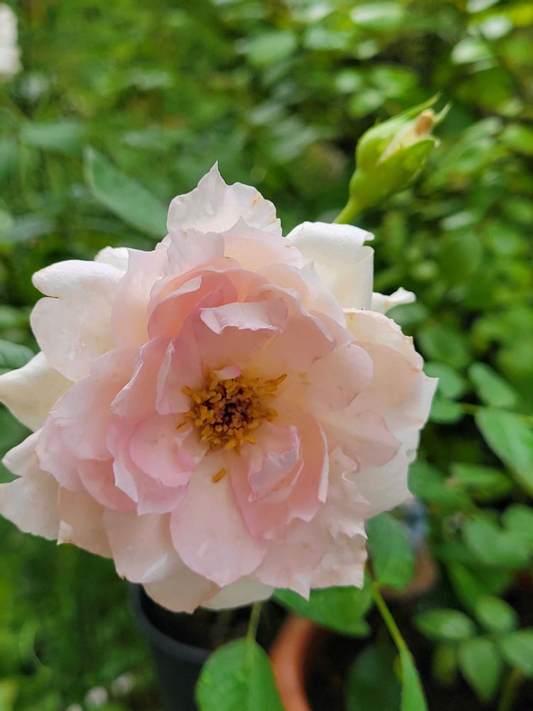 待ちに待っていたバラ シャリマーが咲いちゃってました!嬉しい~❣️のと悲しいの気持ちが(残念)かな!だってね雨で花弁が~😣