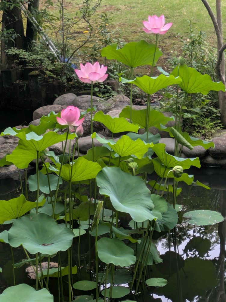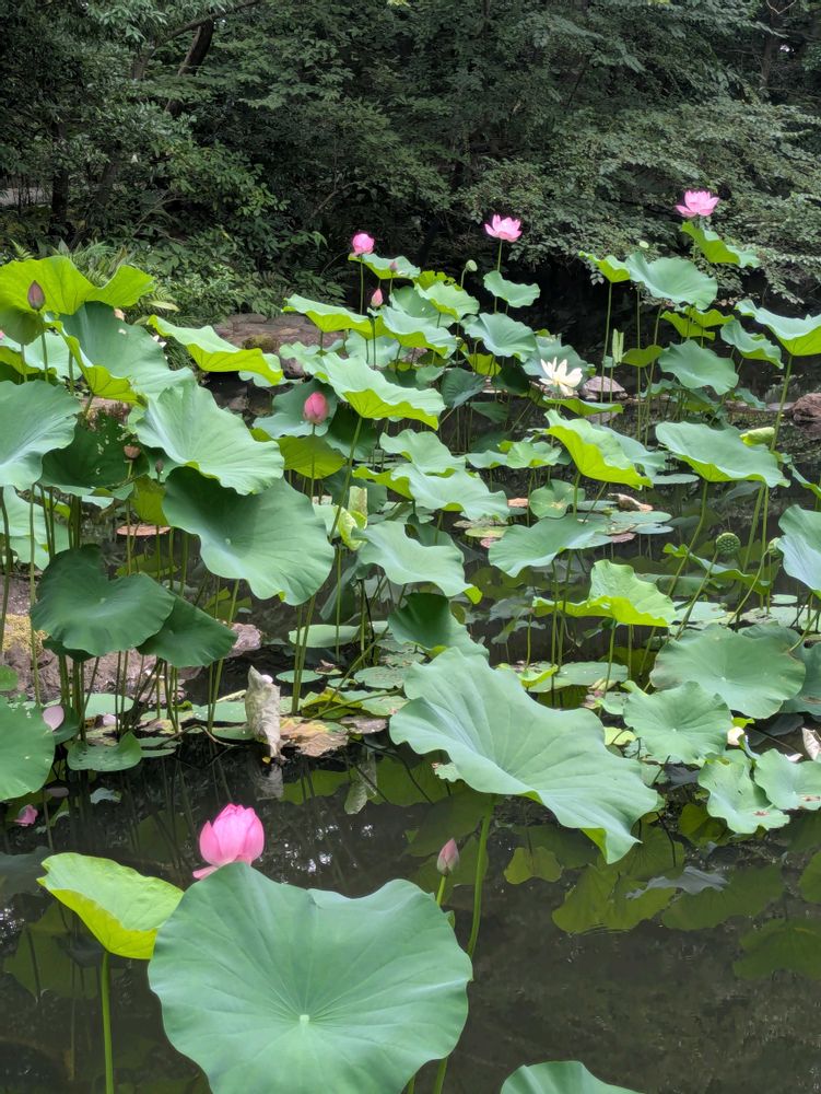 東京根津美術館庭園、この時期は池で蓮が咲いていました。薄いピンク色の色づきが美しいです。