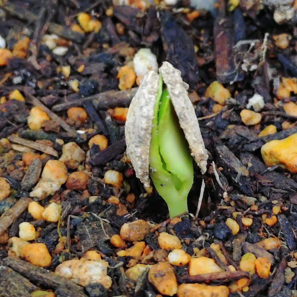②水に浸していたゴーヤのタネからもう一つ根が出てきていたのでプランターの隙間に植えてたところ殻をかぶり出てきてました 帽子をかぶってるよう🤭 こちらも伸びてくかな?🌿