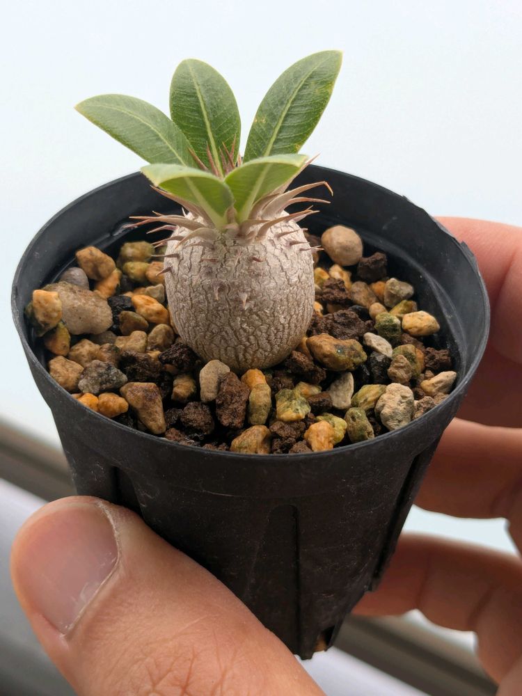 ④パキポディウム・エニグマチカム実生さん。すでに株元がプックリしてキュートじゃあ😍😍😍🥳なんか変なところから根がでている気もするけど、気にしなーい😝