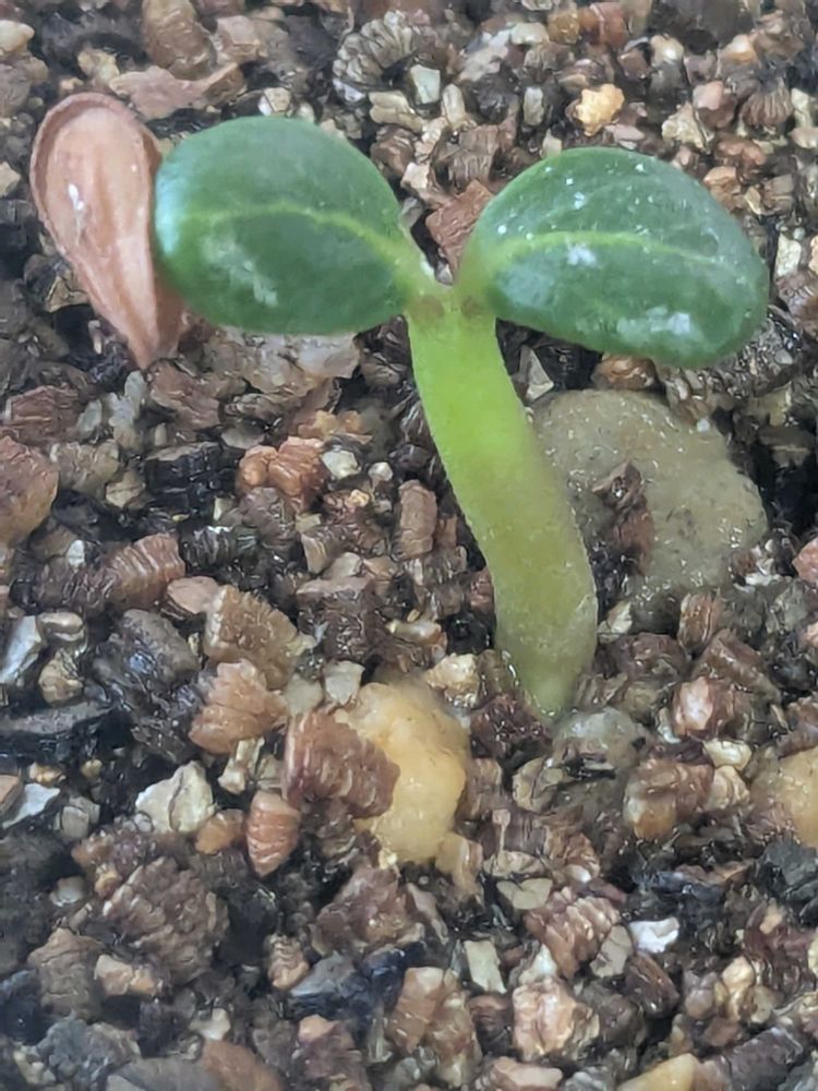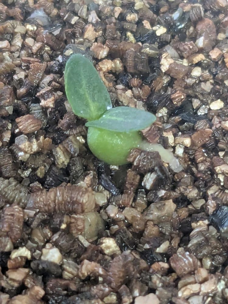 何も知らず、普通の塊根用土に蒔いてしまって、カビてないのは次々干からびてしまったので、カビてないのを一旦取り出して、バーミキュライトを薄く被せてから戻したんですよ。その時発芽しかかってたのがこの子でした🌱移したショックでカリメロ帽子も取れちゃったり😱なるほど、そういう意味でバーミキュライトより赤玉細粒なんですね✍️🧐スポイトで水垂らしながら苗周りのバーミキュライト飛ばすか😅
