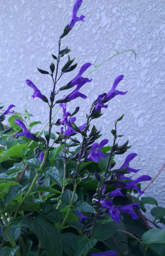 ③枚目…庭で元気な「サルビア・ガラニチカ」さん、隣の「オカワカメ」が巻き付いてます🤭