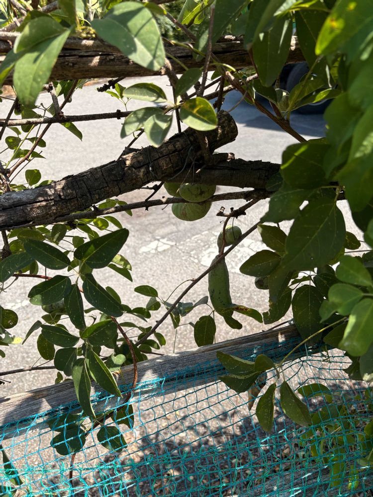 2025(R7)年 紫アケビですが、徐々に成長しています。まだまだ色も変化なく、開かずです。だいぶ寒くなる頃には色づいて、開きかけるでしょうか