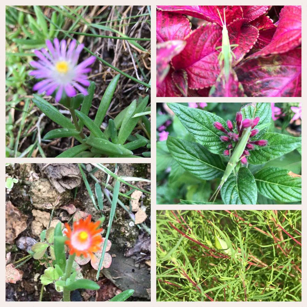 📷右3枚 今朝の水遣りの時に、強風に負けないで葉と揺れているバッタ達発見。