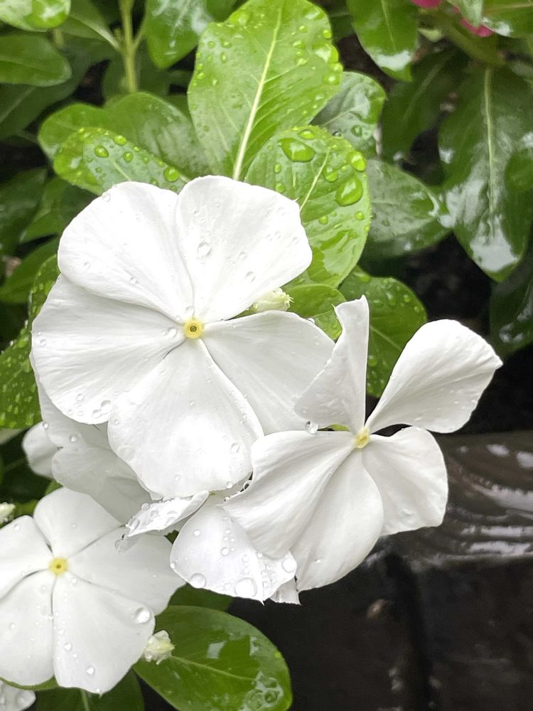 雨上がりのニチニチソウ🤍❤️🤍💗
