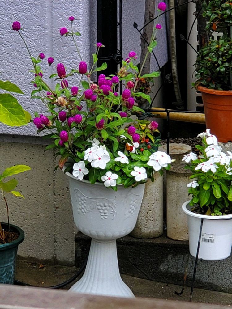 お隣の千日紅とニチニチソウさんが可愛らしいです