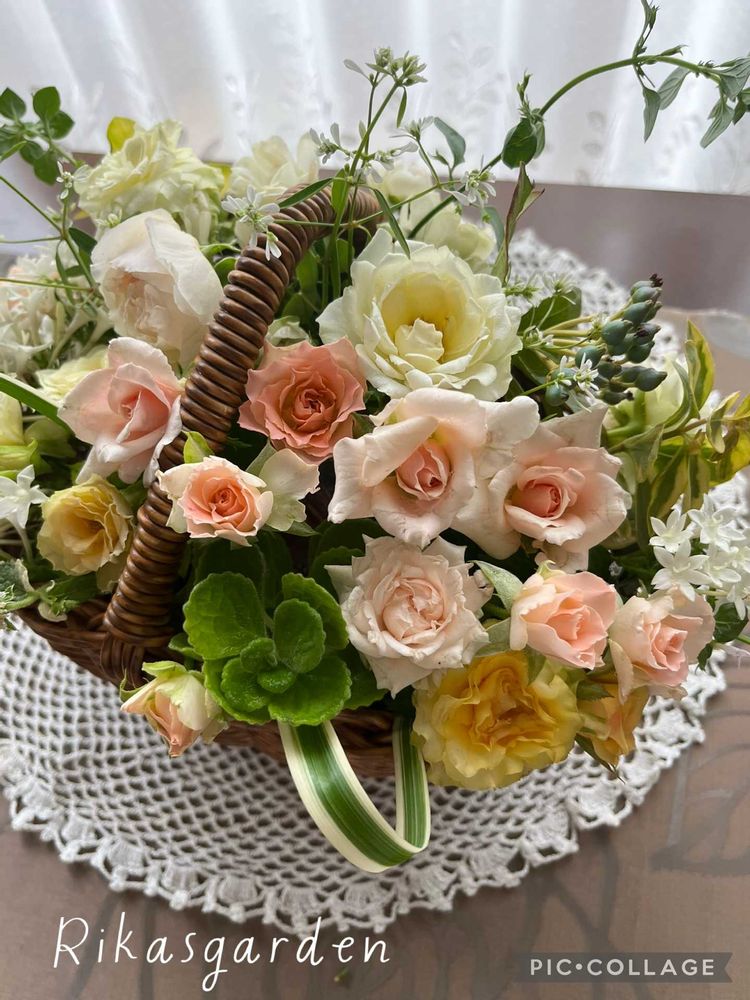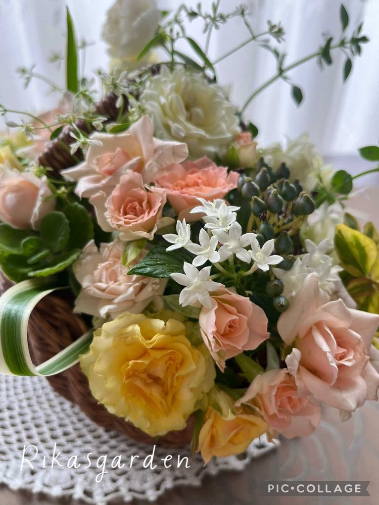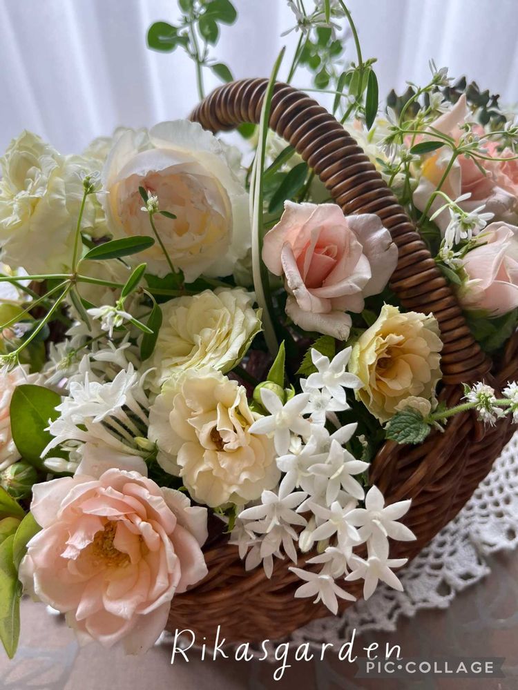 ③④⑤今朝ポツポツ咲いたバラをバスケットに集めてみました。