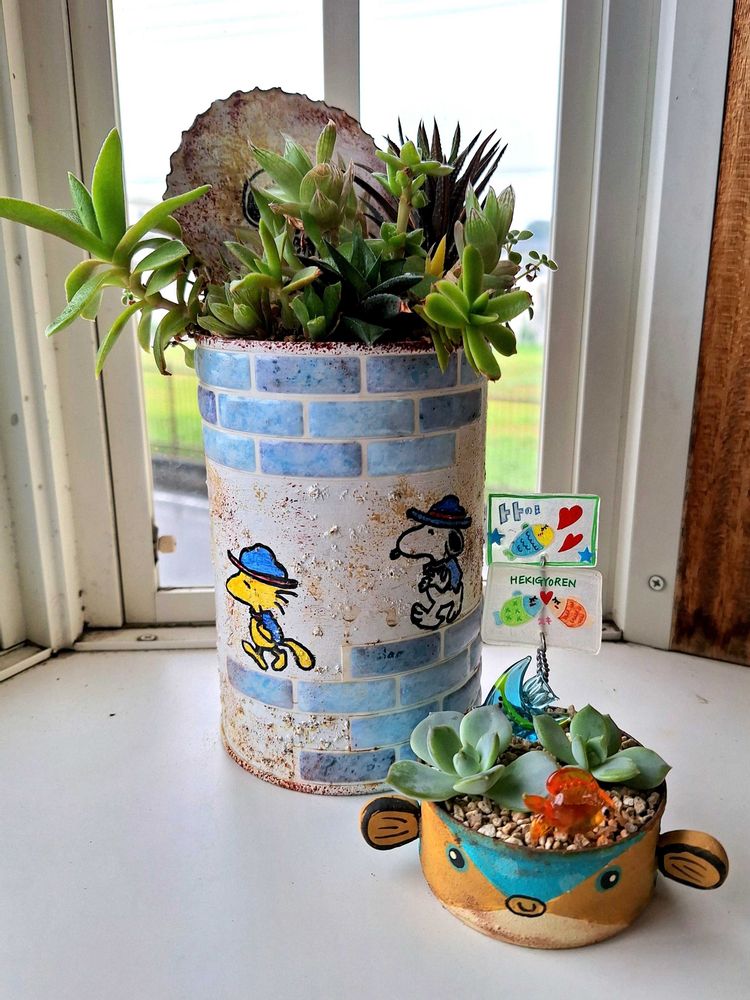 寄せ植えをしっぱなしで、多肉植物が暴れていますが、以前作ったスヌちゃんのリメ缶で、