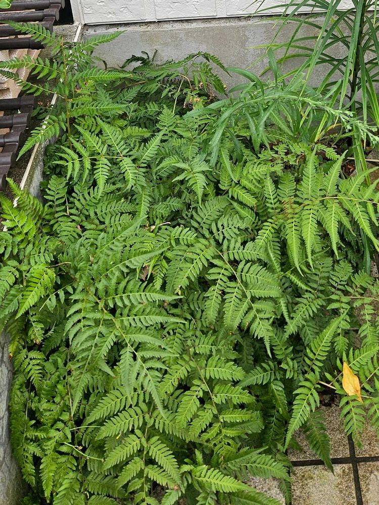 このシダも庭側にドクダミと一緒に生えていたのを昨年カットして適当にこの雑草地帯に植えたら、今年はてんこ盛りになって増えました🌿