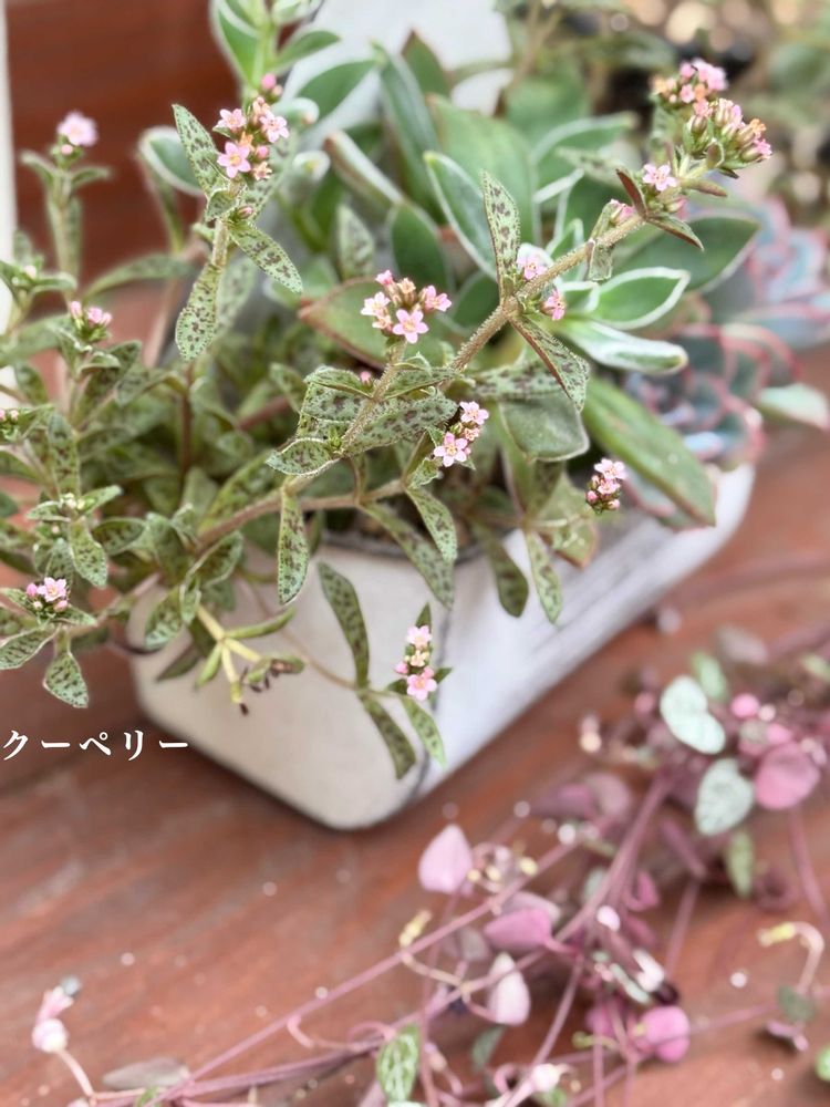 クーペリー、シックな葉にピンクの小花🌸のコントラストが可愛いですね💕