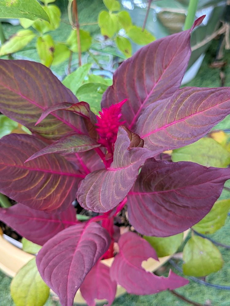 以前これは何⁉️とお尋ねした赤い葉っぱと茎のやつ、どうやらケイトウらしいです。ケイトウらしきパサパサがでてきました。こんなケイトウお迎えしたことはないので😗HCで種飛んできてたのかな⁉️