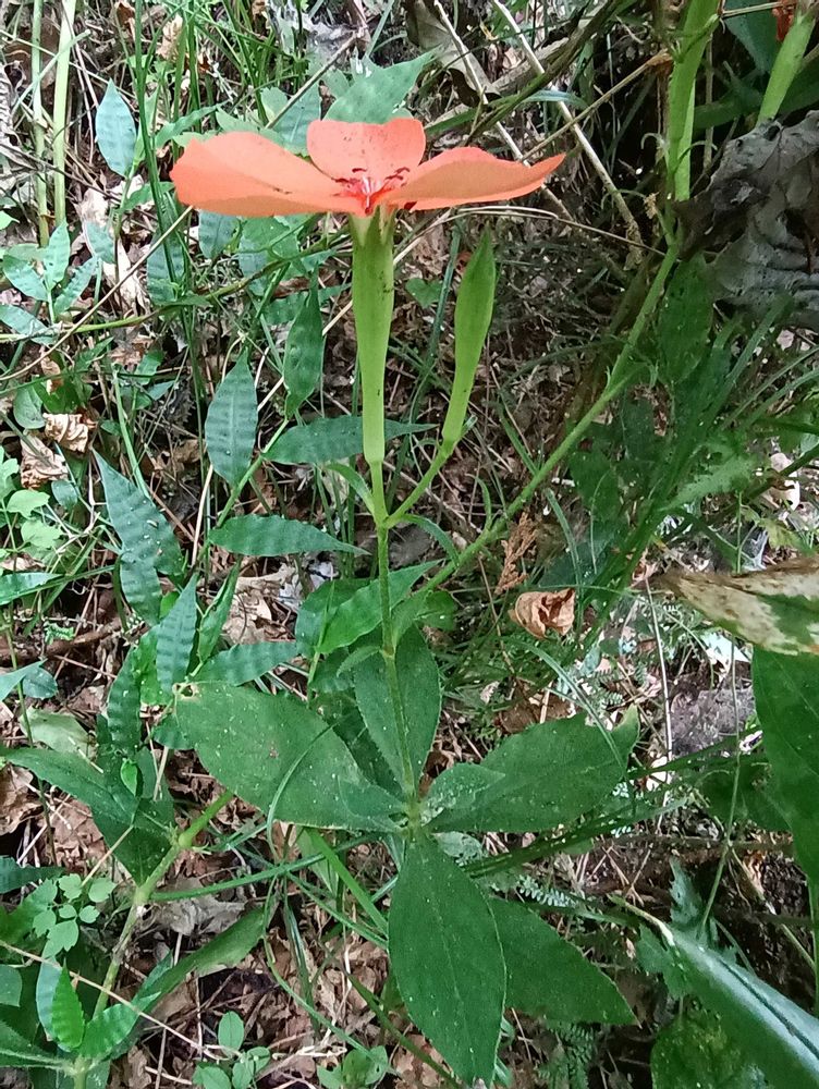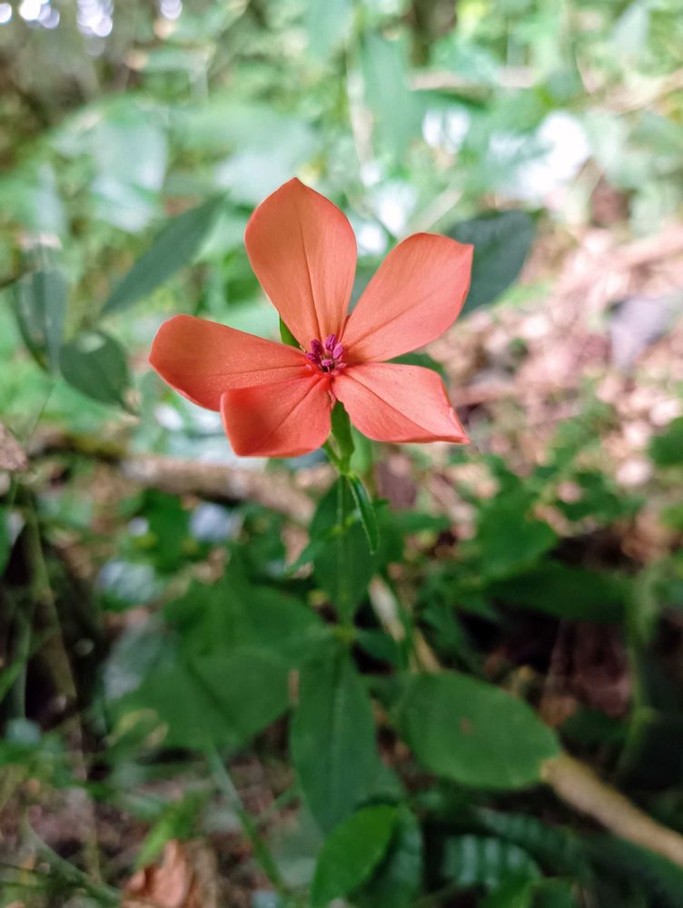 薄暗い林の中で、赤い鮮やかな花が咲いているのには驚かされます。