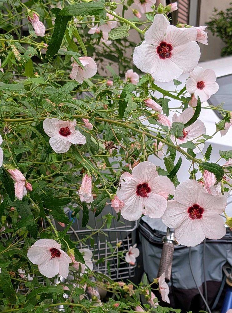 昨夜からの大雨でヤノネボンテンカは枝がしなだれてしまいました。