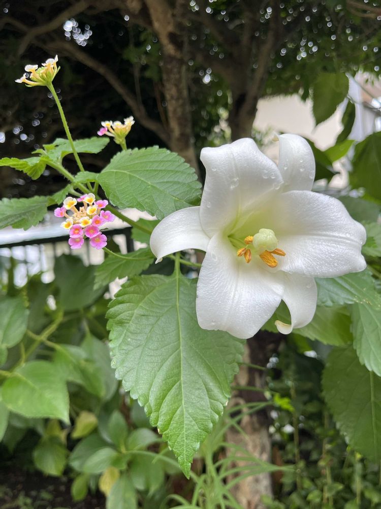 こんにちは、小雨、26.6℃、16:30ムシっと暑い。昨日からの恵の雨、降ったり止んだり、合間に庭点検。シンテツポウユリ、ランタナに並んで1輪、3つ同時に咲きました。🥰😍😻😋😸😸