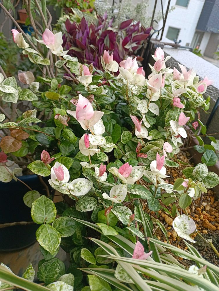 緑の葉っぱは、斑入りね。新芽が綺麗よね。💚🤍🩷💚🤍🩷