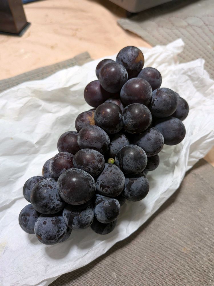 雨上がりに少し早いかなぁと思いながらもキャンベル・アーリーの試し採りをしてみました。結構立派な房でした。味は少し酸味がありますが美味しかったです。