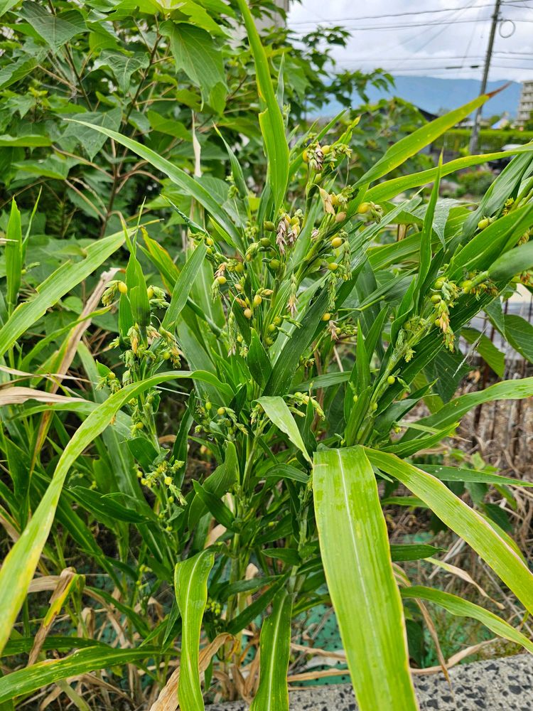 ②③写真に見られるように柱頭が枯れてくると雄性小穂は緑色のつぼを貫いて 総状に突き出て花粉を出しはじめます