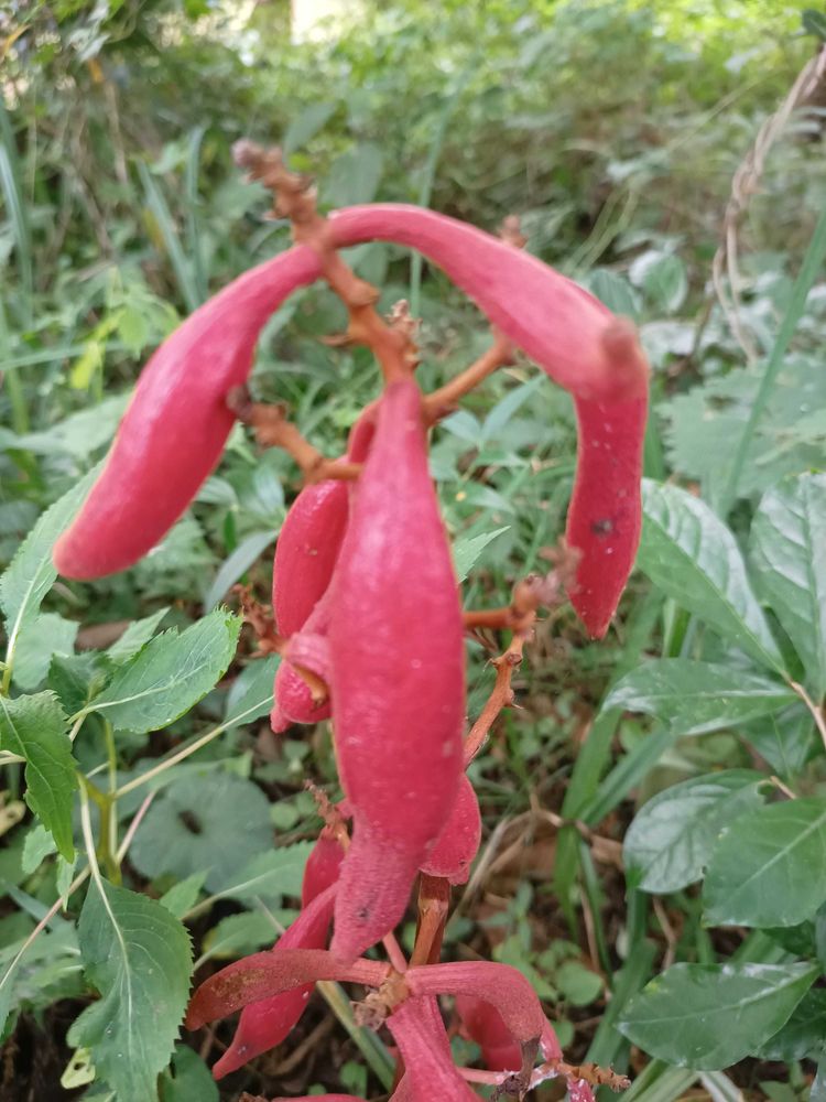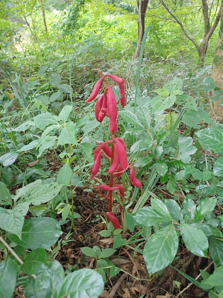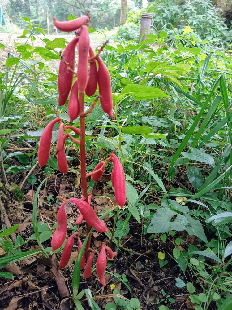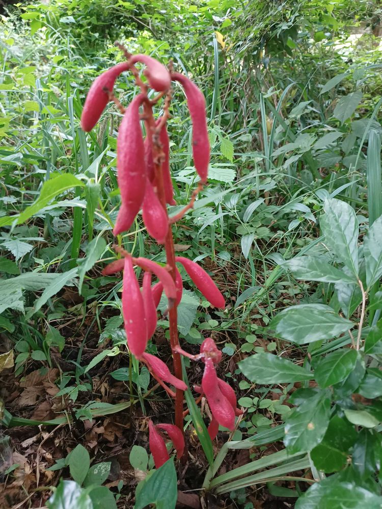 薄暗い林の中で茎も実も赤いツチアケビが実をつけています。草丈50cm〜60cm。名の由来は実がアケビに似ているのでツチアケビ(土木通)と名付けられたそうです。アケビというよりウインナーソーセージみたいですね。ちょっと不気味な感じもします。
