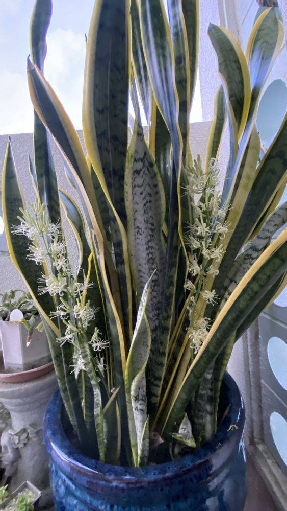 こちらのサンスベリアは夫が実家から20年ほど前にに小さな株(20cm)を植え…現在では1m 20cmに大きく成長しています😳🪴 他にも鉢植え🪴がありますが…お花が咲くのはこの一鉢だけですね🧐