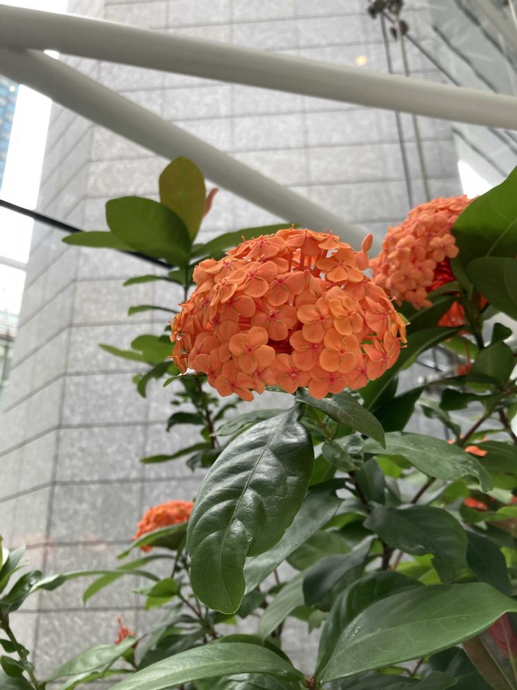 外出先のビルの中で。アジサイのような咲き方しているけど、調べた感じサンタンカ?