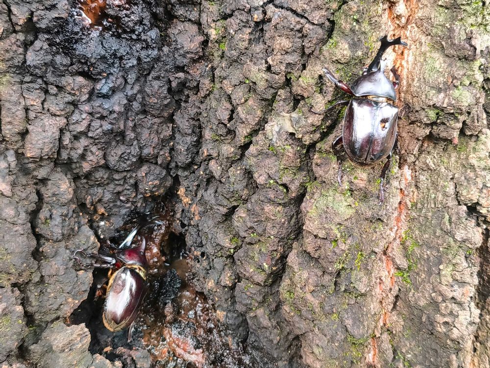 時刻は朝8時前くらいだったので夜行性のカブトムシ🪲はいつもは隠れる時間ですが、昨日は前日の雨で樹液の匂いが強くその樹液をたくさん吸いたいのかこんなに明るい時間でものんびりとお食事中でした🤭