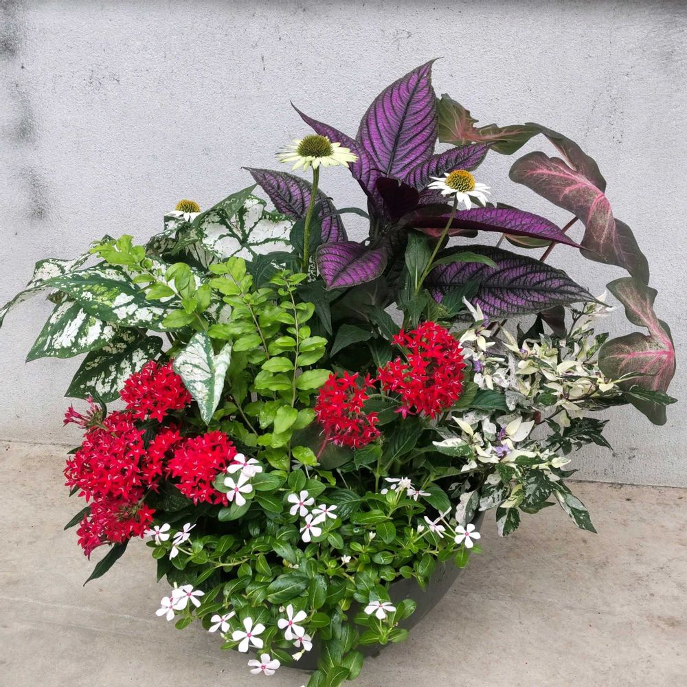 カラジウムとペンタスをメインに、ストロビランテスや、日々草を使って夏らしい爽やかな寄せ植えを作成してみました!