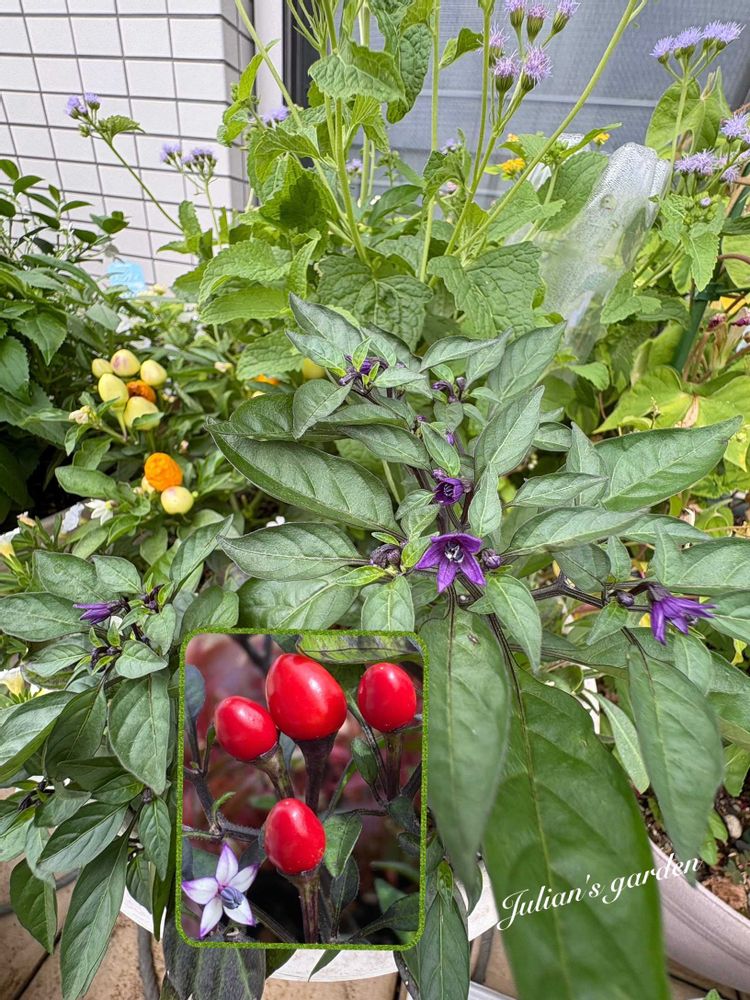 ③昨年の観賞用トウガラシの赤いお花⬇️がとてもきれいだったので 種をパラパラしておいたらなんと芽が出て 忘れていて何かなと思っていたら お花が咲いて🤍💜💚