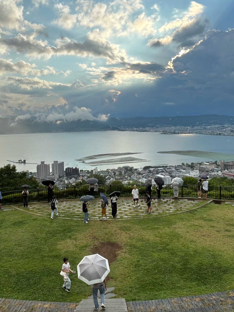 「君の名は」の舞台になった諏訪湖の夕焼けが見たかったようだが生憎の雨☔(孫から送って来たpic)