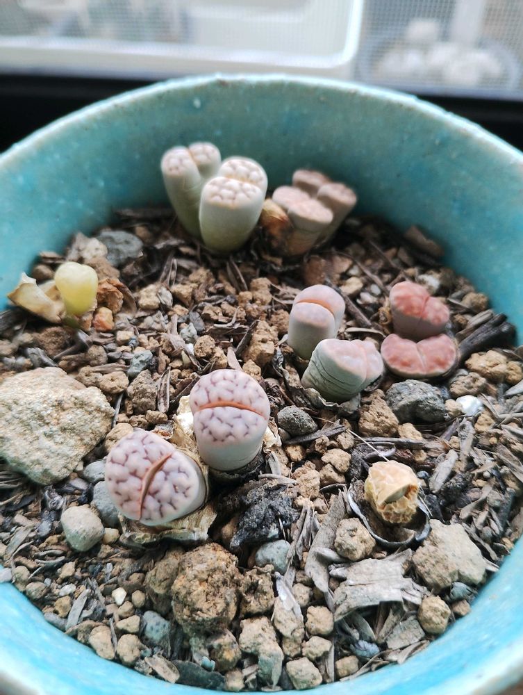 この子達はホームセンター産で初めて長い間生き続けてくれてるリトープスです。何度も脱皮はしてるのにお花はまだ見た事無いので今年こそは見てみたいです😍