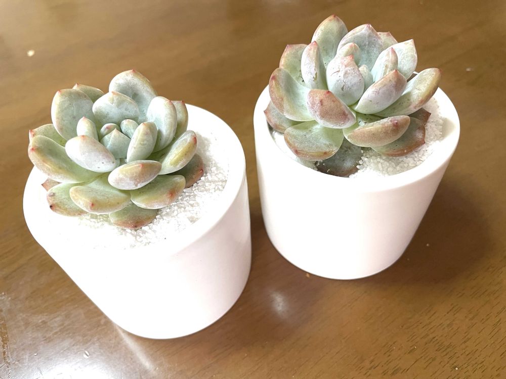 久しぶりに寄せてた多肉を夏らしく飾るために、白い陶器に個別に植え変えてみました。