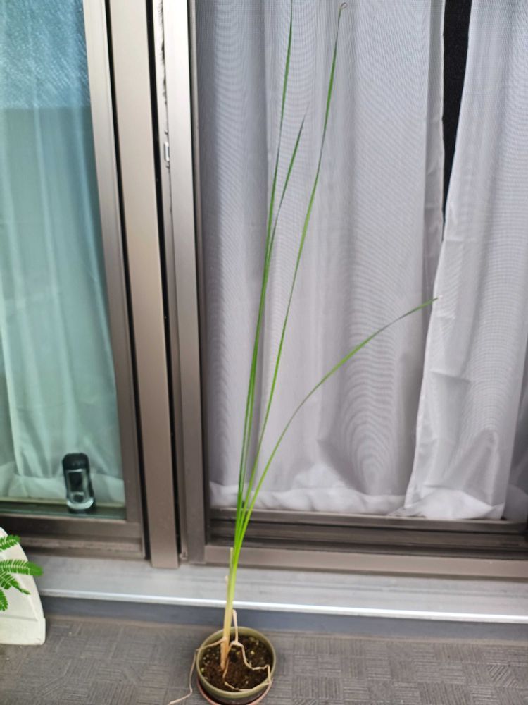 雑草かなと思いながらも水やりしていたら140cm位まで伸びました。単子葉植物みたいで、横巾も最大部でも1cmもない位なのに、少し厚みがあるせいか強風でも一人立しています。