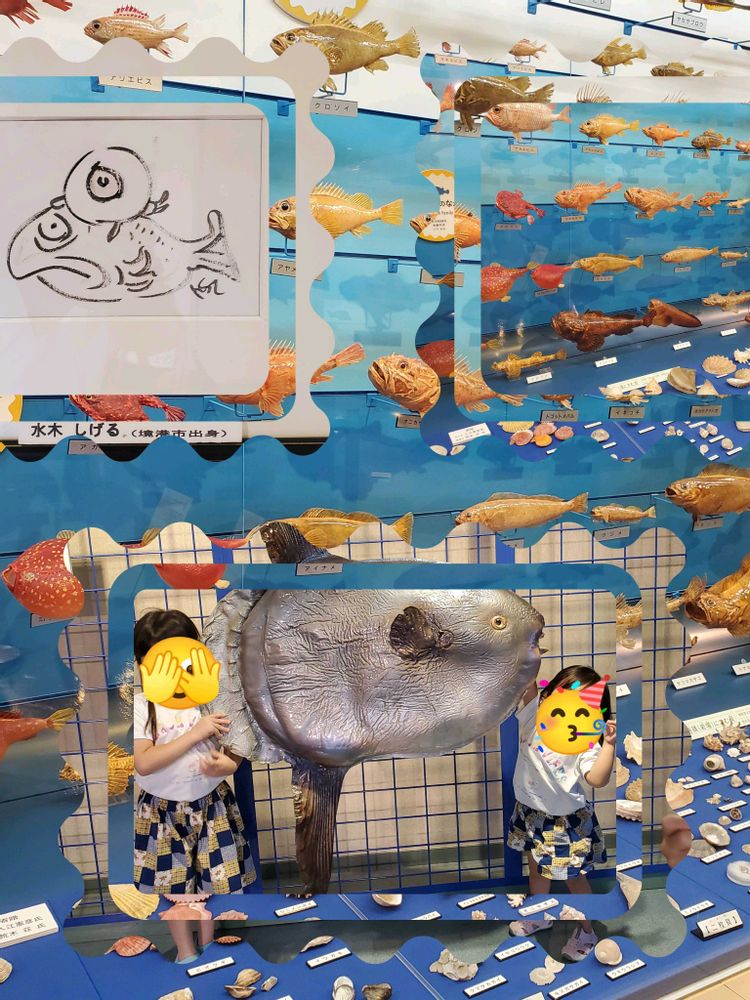 雨☔なので鬼太郎ロードもお魚ロードも歩けなかったけど…孫達はお魚やマンボウ、カニ等の剥製に興味津々で楽しんでました🎵女の子の子2人は私がオソロで縫ったキュロットスカートはいてくれて嬉しい~😆⤴️💓