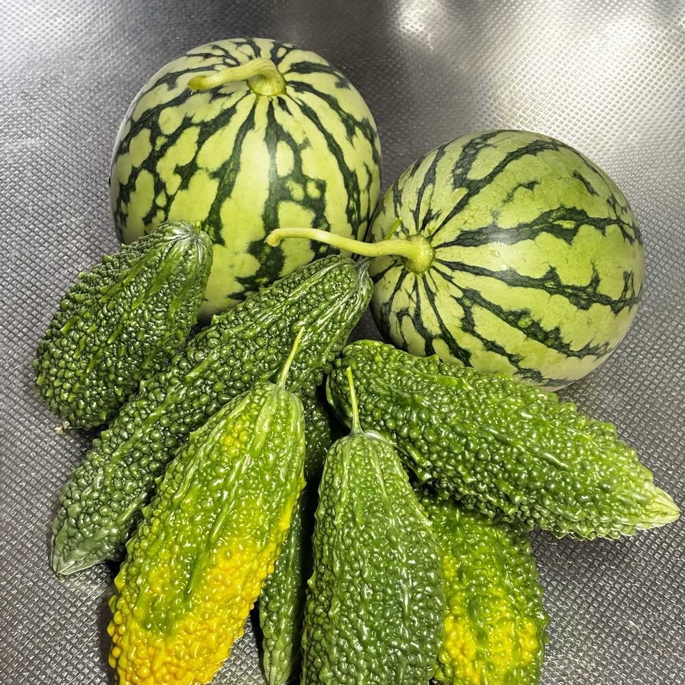 ② ゴーヤ7本 小玉スイカ2つ 1.4と1.3kg 小さい方はお仏壇へ